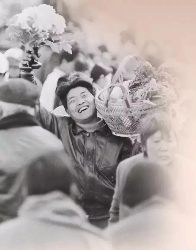 (一位赶集的居民满载而归。当时,他手上举的塑料摆花几乎家家可见。)